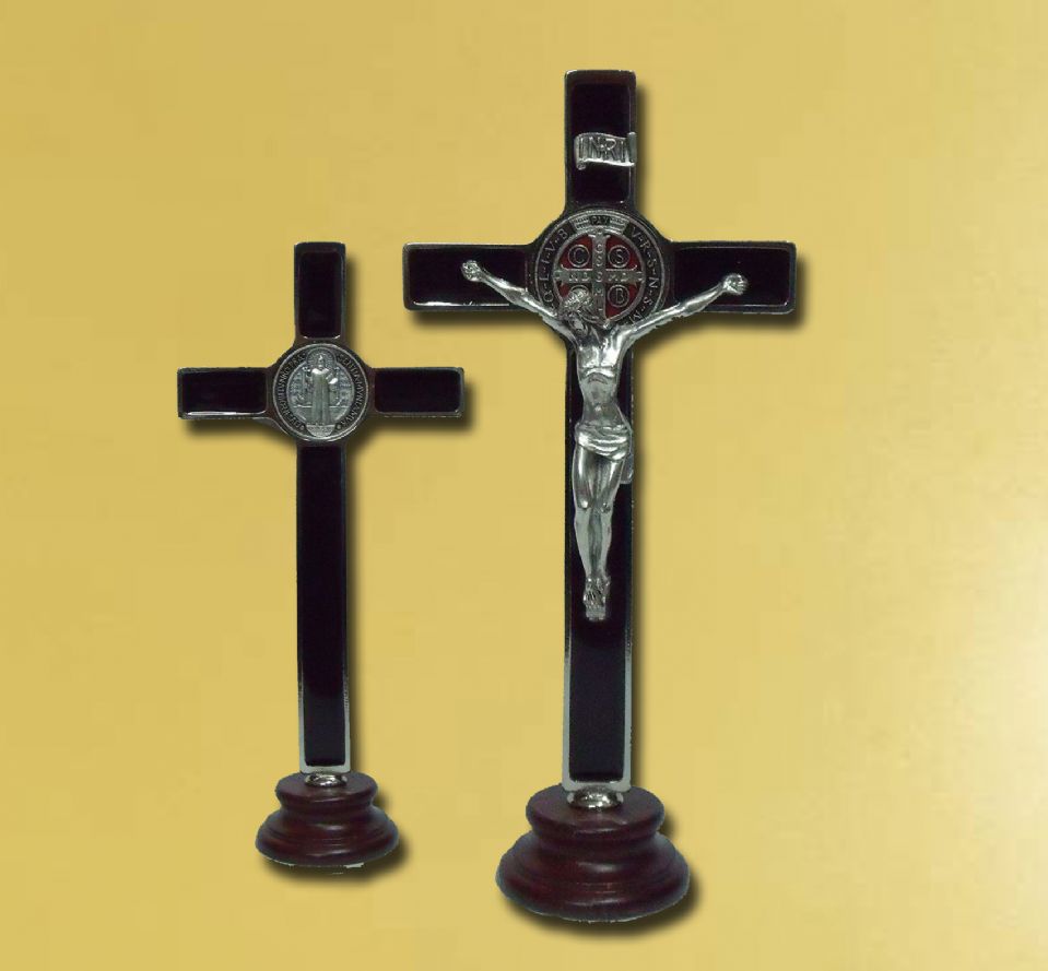 Cruz de San Benito, con medalla esmaltada en color negro, realizada en aleación metálica y esmalte en color negro. La cruz tiene base realizada en madera (21x10 cms).